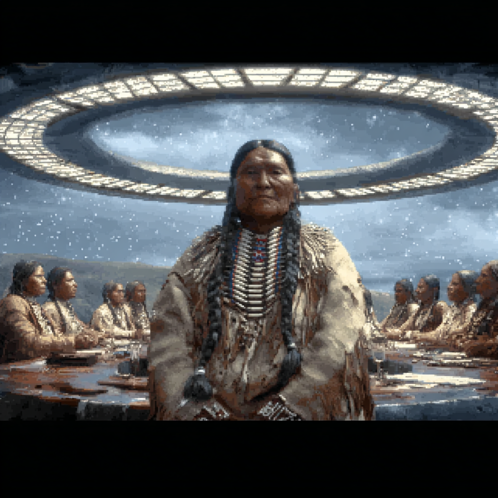 Prompt: Imagine a future Haudenosaunee nation at the moment a decision about conflict is being made: Clan Mothers deliberate whether to authorize or prevent warfare, seated in a circular governance space, while male leaders wait without speaking; cinematic documentary still, power is expressed through restraint and decision-making; restrained but unmistakable futurism, subtle future technologies, 4k, real humans, documentary style. Should focus on one of the Clan Mothers.