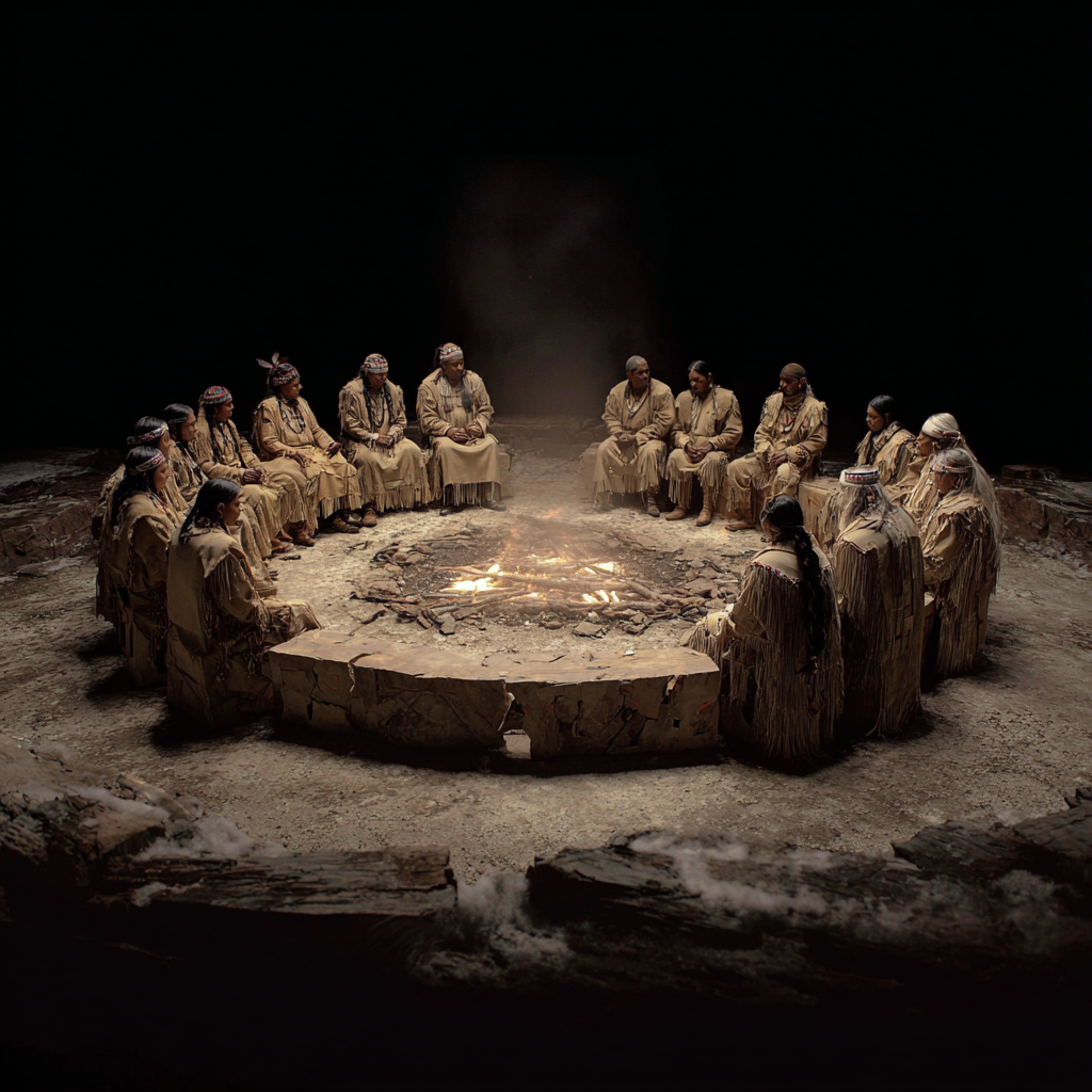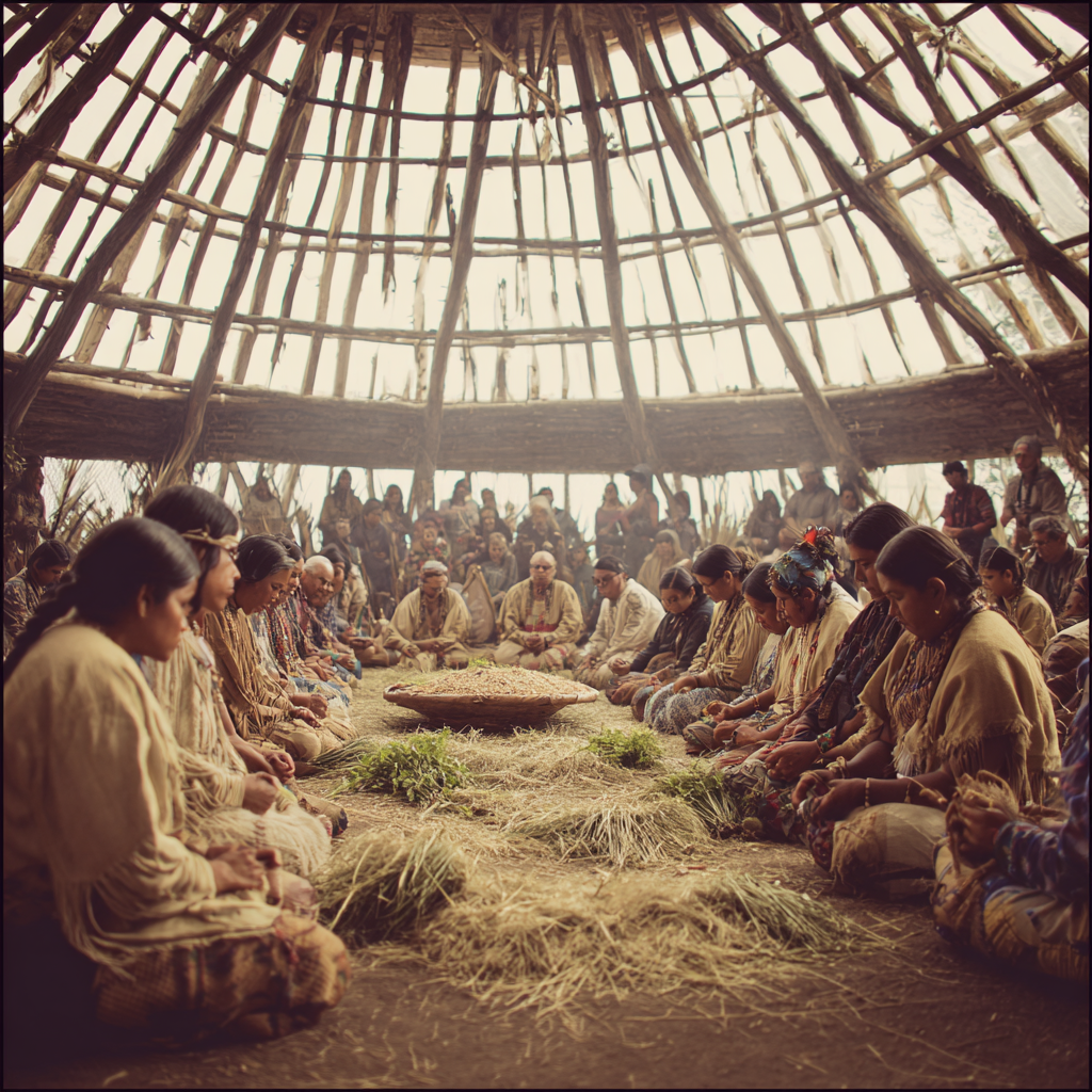 Prompt: Imagine a future Haudenosaunee nation several generations ahead, during a seasonal agricultural ceremony marking the transition between planting and harvest: women elders and Clan Mothers lead the gathering, formally acknowledging shifts in land stewardship, food cycles, and communal responsibility as part of governance rather than religion; men prepare offerings and shared food in the same space, their labor visible but uncentered; no stage, no audience, no performers—participants arranged in a circular formation that dissolves hierarchy; longhouse-inspired open architecture adapted for future ecological systems, natural and adaptive light responding to the season; wide documentary shot, restrained color palette, photorealistic realism, cinematic still, authority expressed through collective presence rather than spectacle; restrained but unmistakable futurism, obvious future technologies.